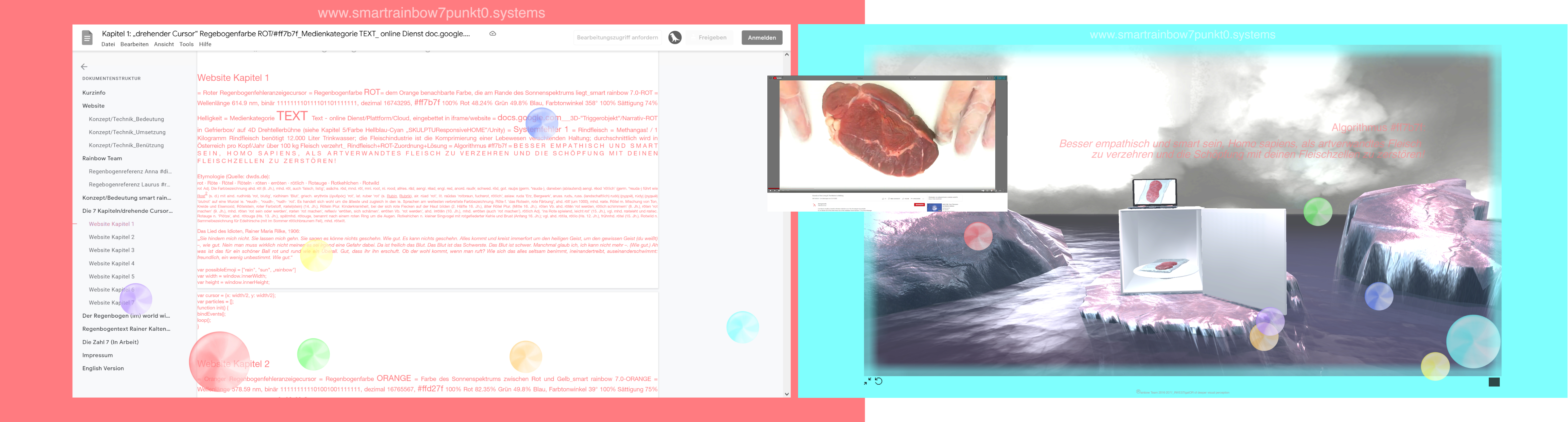 The source of the smart rainbow 7.0 website www.smartrainbow7punkt0.systems respresents the multimedia installation smart rainbow 7.0. Those links the error display of (older) macOS operating computer systems (“rotating rainbow cursor") with both the meteorological phenomenon of the rainbow and the topic of global warming by using the consisting elements of the rainbow, (frozen, colored) water and (electric) light for „downloading“ the „rotating rainbow error cursor“ via seven ice sculptures into the real, technical upgraded space of a freezer box. In line with the third participation of smart rainbow 7.0 at the exhibition “Καιρός – recall of earth III“ by Sophia Panteliadou at AIL Vienna, the entire installation including all complementary material (in progress), were precisely "smart rainbow 7.0 – conceptually fractionized” "uploaded” into the virtual online space. Hence these 7 rotating error cursors or floating light particles, which function as the seven chapters of the website, represent each a color of the rainbow, assigned to a media category/form of appearance, whereupon related content is successively uploaded on the media specific online platform/cloud in the www, embedded via inline frame on the website or provided via hyperlink if x-frame lock is active.