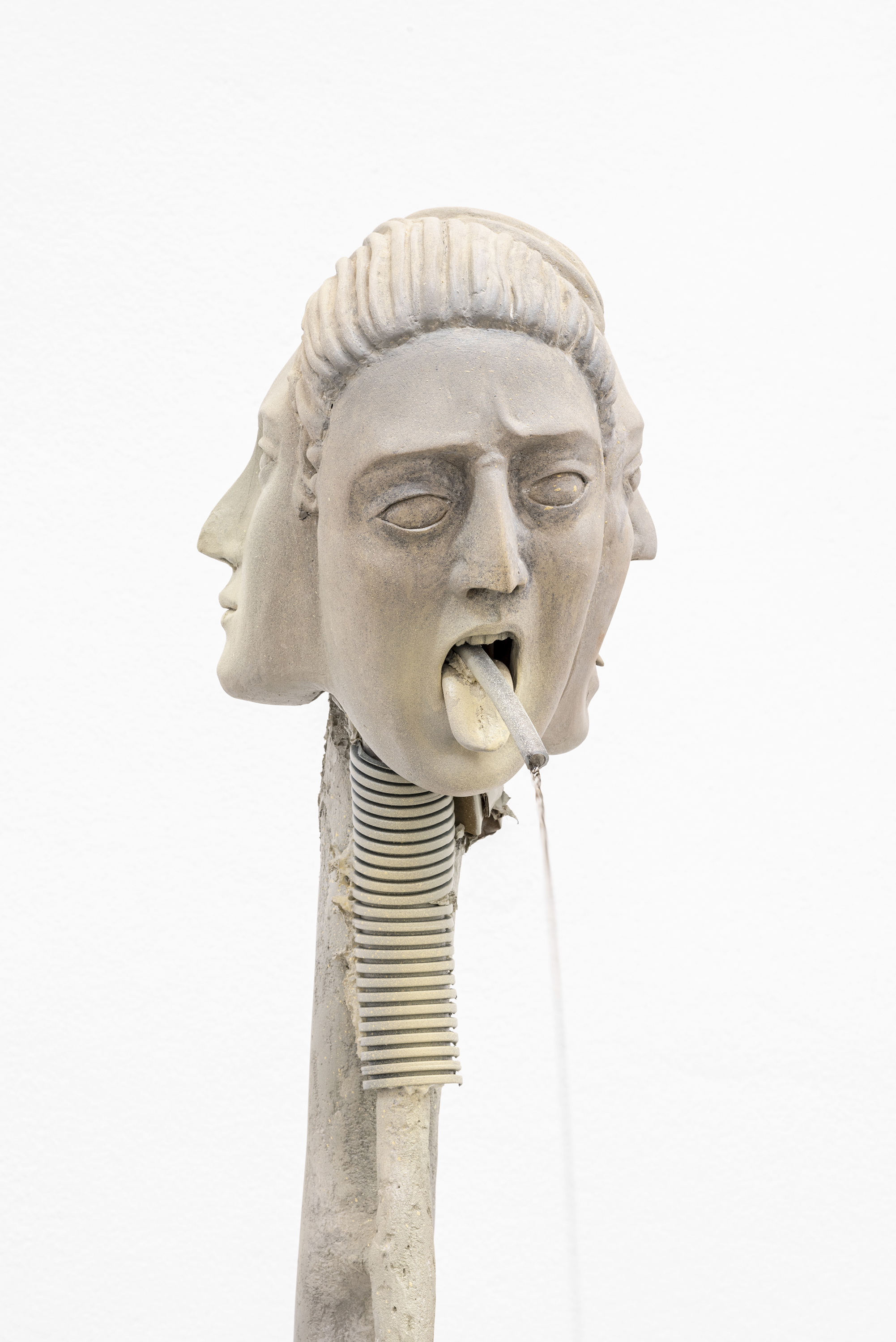 My latest in situ work consisted of two equally large, kidney-shaped water basins rest on the floor, each with 2.30m high gargoyles attached. The mannerist-symbolist gargoyles eloquently combine familiar cultural-historical motifs with contemporary industrial forms. The gargoyles are crowned by ominous heads: a gargoyle with a Janus head as a tricorn opens up three visual axes to the room. One face is still, one screams, the third sticks its tongue out. The earth spirits want to draw attention, to show the limits to the appropriation of nature and its resources, which has been increasing since industrialisation. In the contradictory use of graceful ancient symbols and arte povera, I point out the unwelcome connection between high culture and decay and hints at premonitions of the end times. .