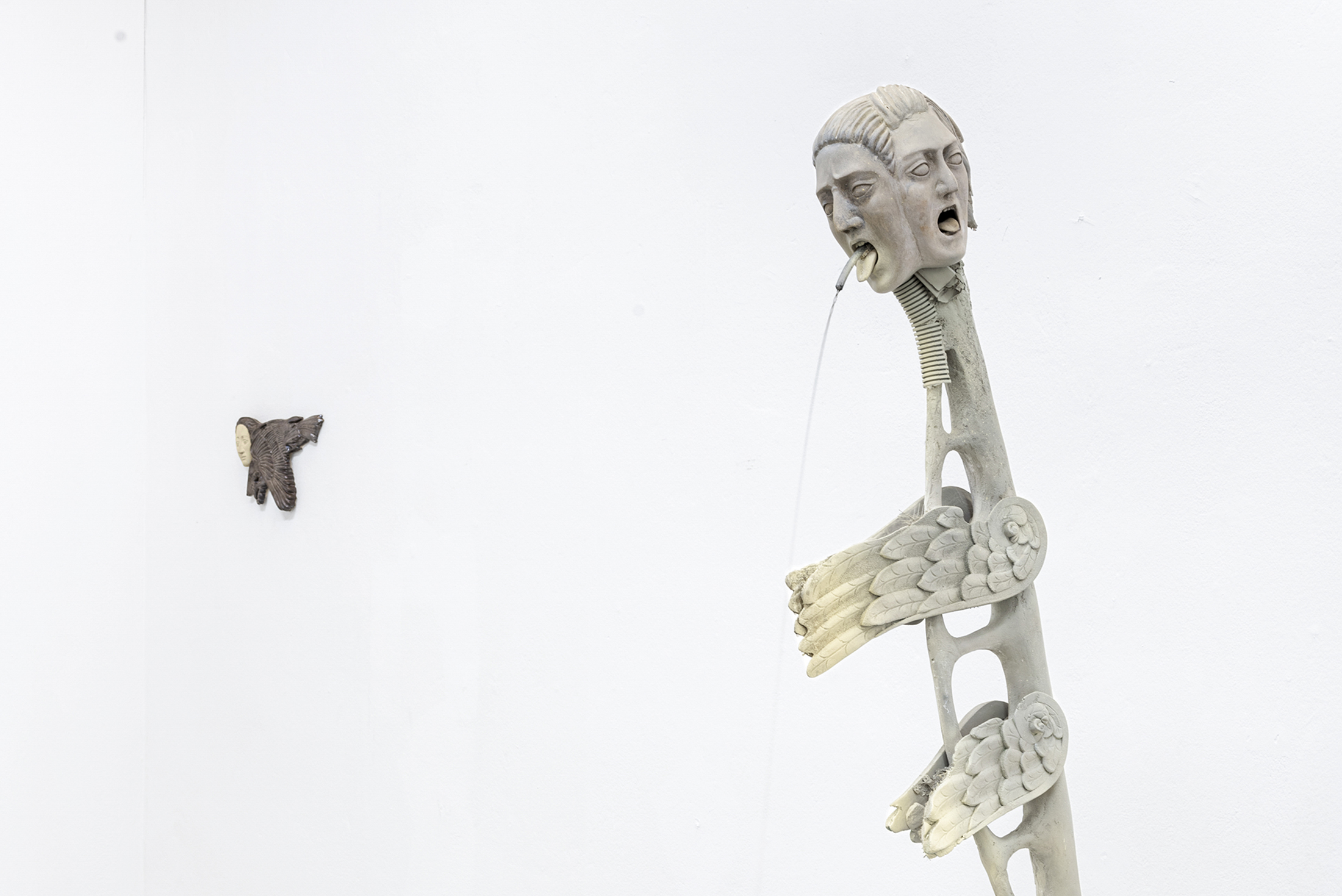 My latest in situ work consisted of two equally large, kidney-shaped water basins rest on the floor, each with 2.30m high gargoyles attached. The mannerist-symbolist gargoyles eloquently combine familiar cultural-historical motifs with contemporary industrial forms. The gargoyles are crowned by ominous heads: a gargoyle with a Janus head as a tricorn opens up three visual axes to the room. One face is still, one screams, the third sticks its tongue out. The earth spirits want to draw attention, to show the limits to the appropriation of nature and its resources, which has been increasing since industrialisation. In the contradictory use of graceful ancient symbols and arte povera, I point out the unwelcome connection between high culture and decay and hints at premonitions of the end times.