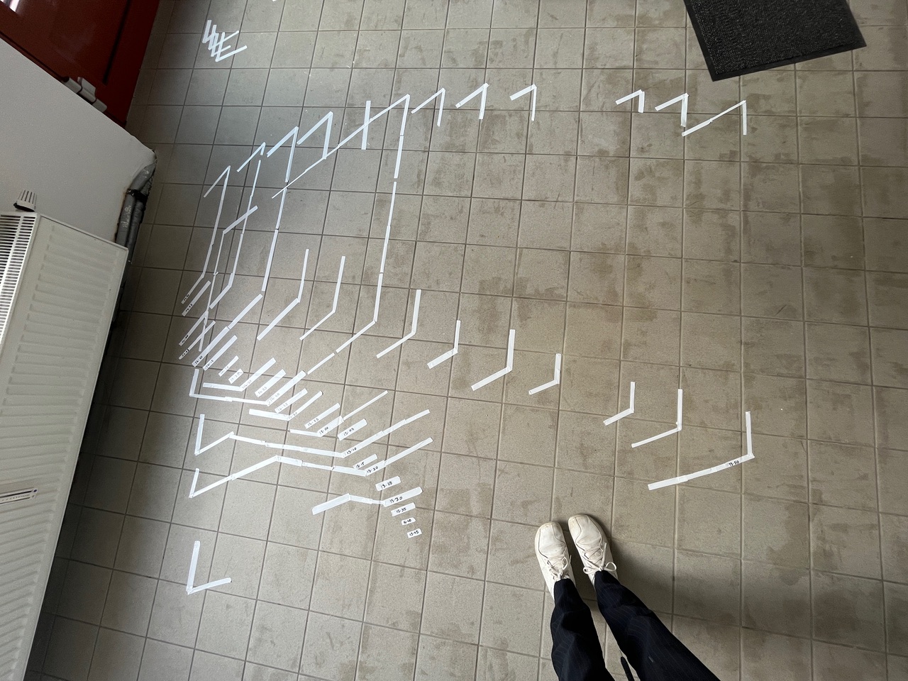Sun Dial is a performative intervention in the exhibition space that marks the edge of the shadow cast by the building's exterior wall on the floor when the sun is shining - capturing the movement of the earth relative to the sun on the tiles of Mz* Baltazar's Laboratory.