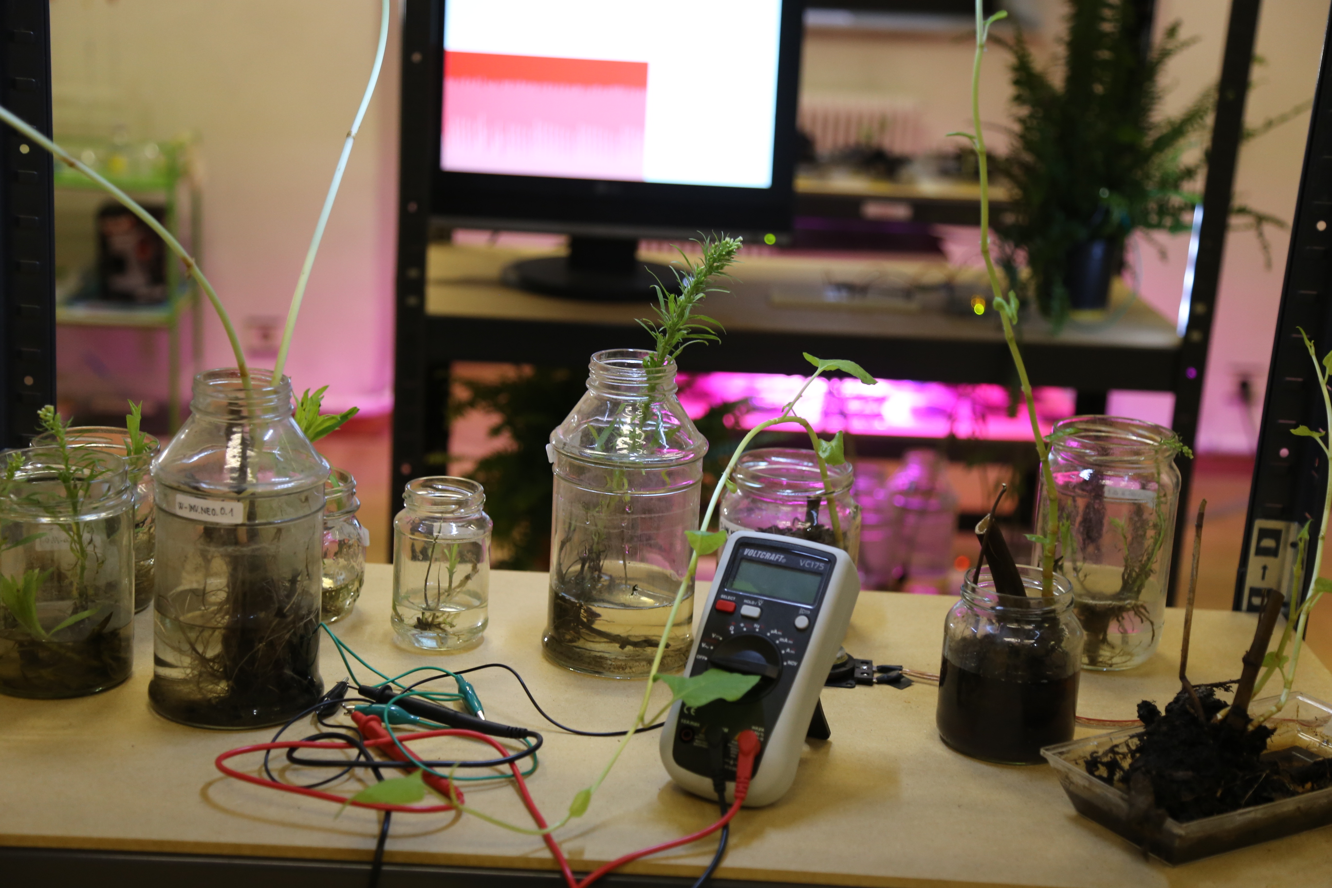 In the Language Lab - depending on their state of growth - the foreign plants are exposed to German and a behavior course, while their resistance value is measured electronically. The resistance value ultimately decides the integration value of the plant: