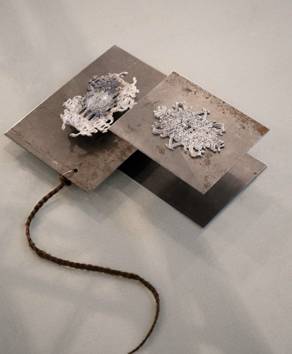 An installation reflecting on the topic of russian imperialism through the lens of self-identification via language. Personal messages, thoughts, and notes are written in various languages (Ukrainian, Russian, and English) and encrypted into tin casted sculptures by customising the type and installed on iron pedestals. By encoding personal narratives, I am referring to the loss/search for identity as a result of russian propaganda within post-USSR countries and the imperialistic narratives that spread