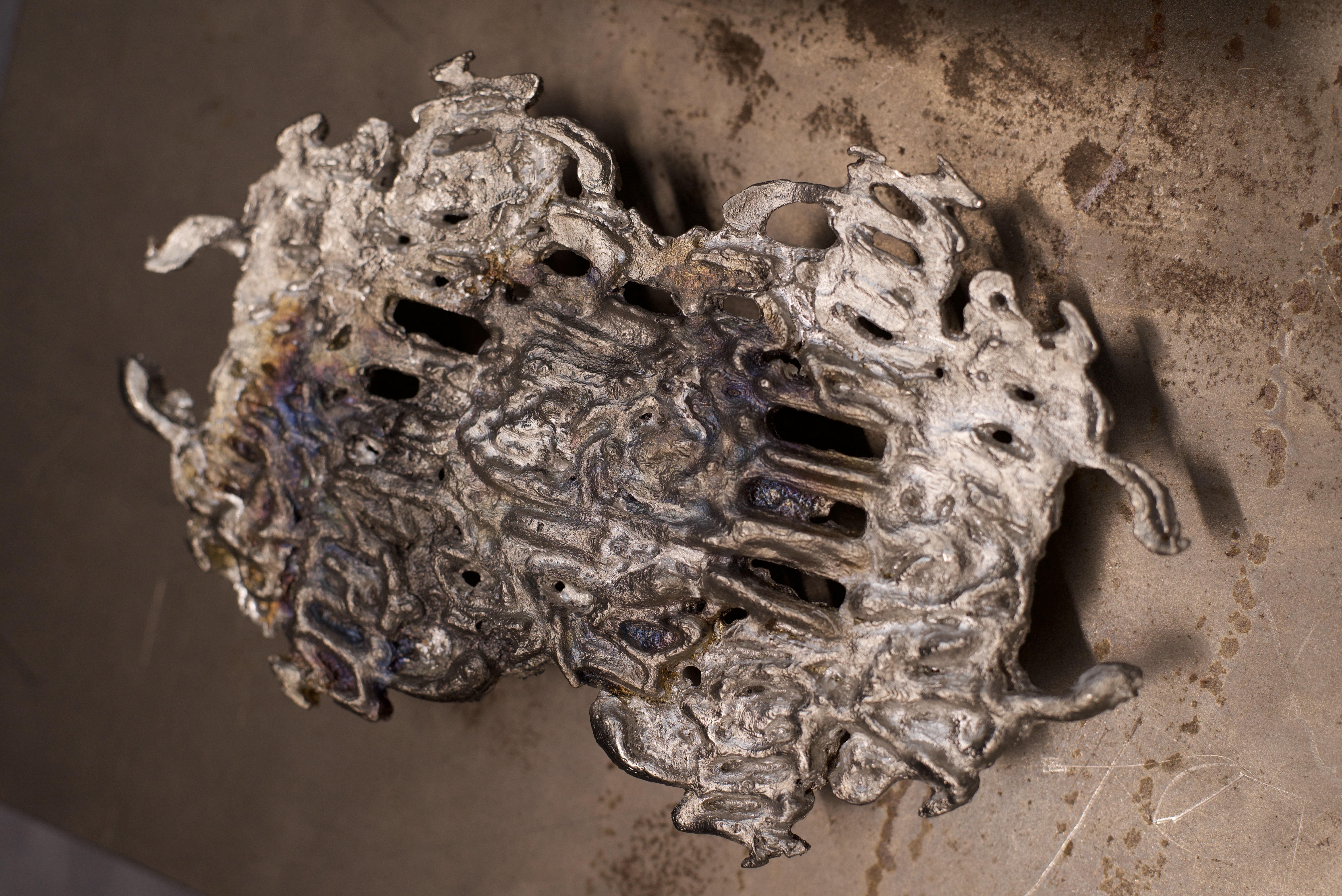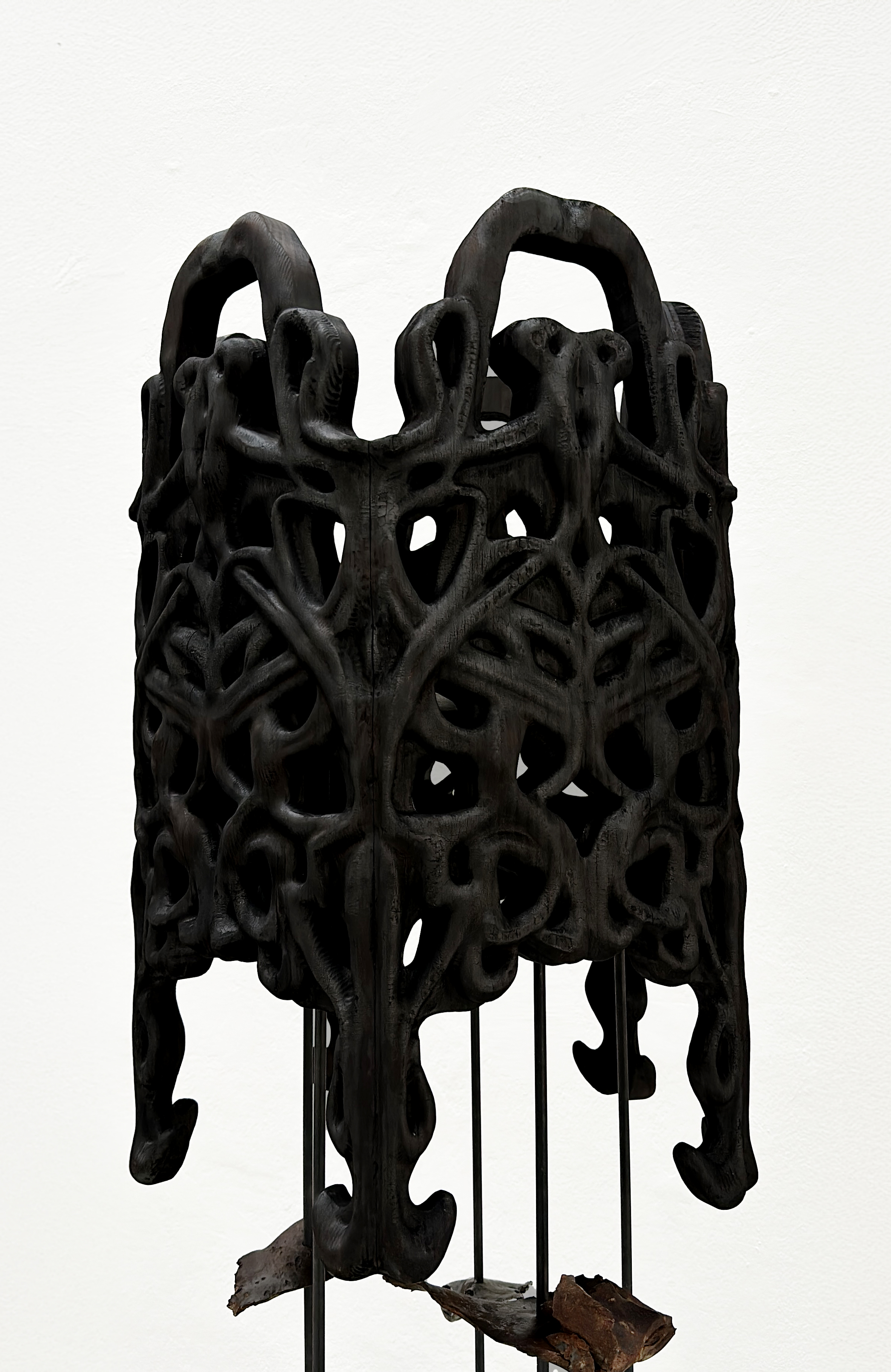 by Russia in the war in Ukraine. The sculpture itself is inspired by carousel-shaped music boxes that help children fall asleep. More figurative elements, like horses or ballerinas, are replaced with debris from a Russian missile, now trapped in a peaceful dance. The debris I collected next to my home after surviving a Russian ballistic shelling. Carved ornaments are made through the process of type customization and refer to the functional components and visual appearance of a missile.