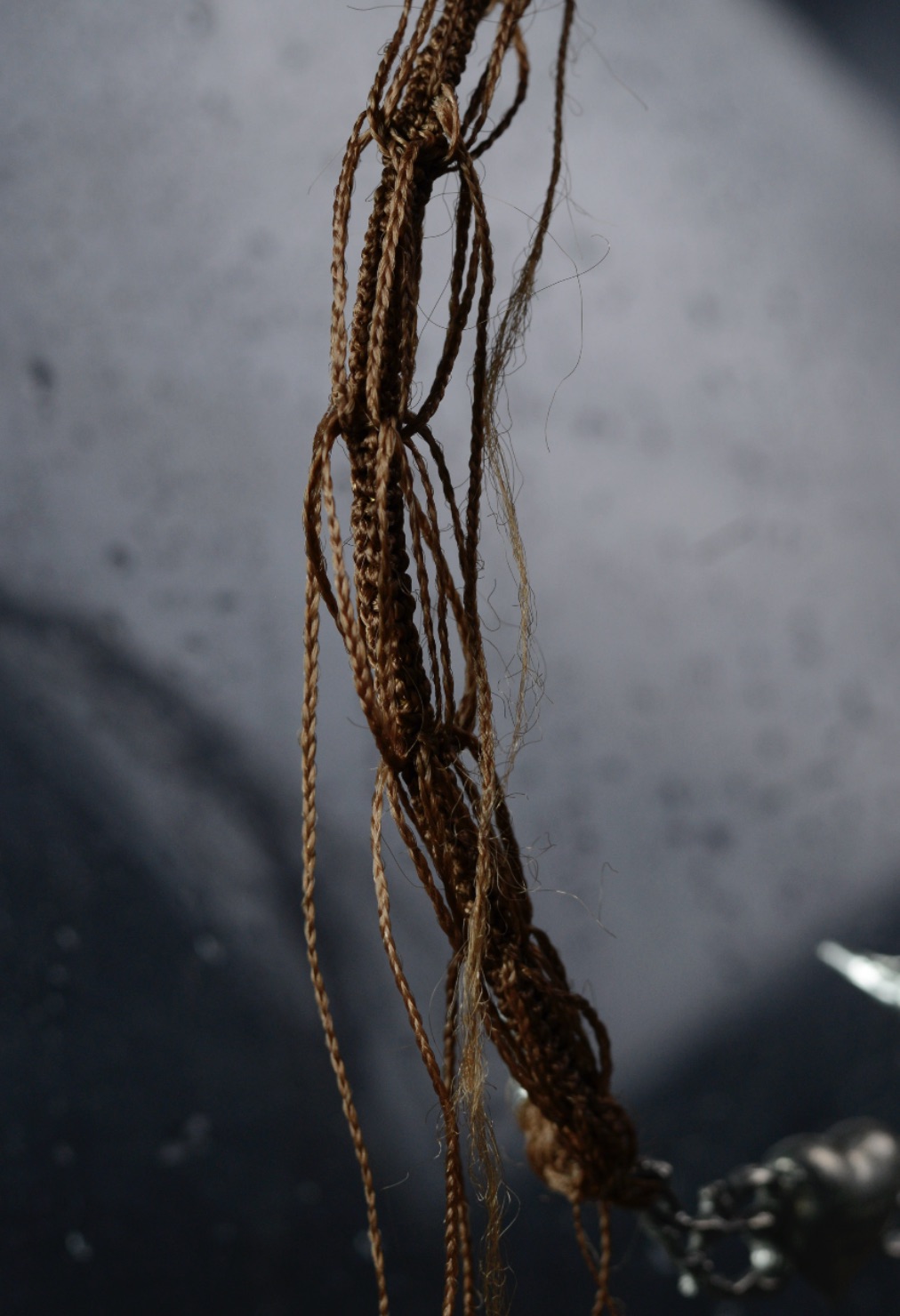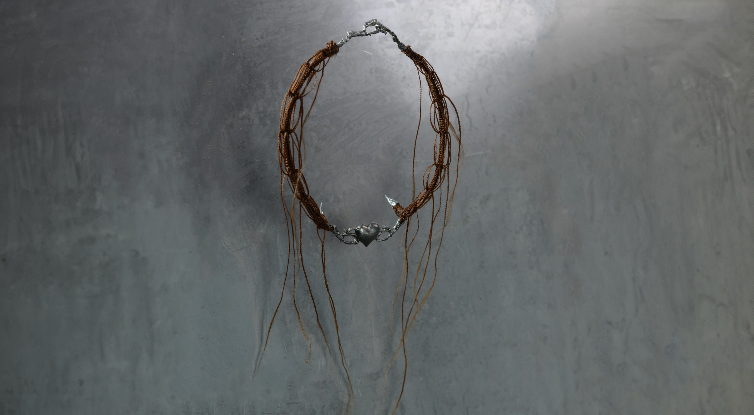 find myself waiting” (self-portrait telling the story of the personal experience of fleeing from war, 2022). Dedicated to someone potentially (not) existing, the work is made using the technique of the hairwork, which was used throughout the XV–XVIII centuries to create mourning jewellery from the hair locks of dead and loved ones.