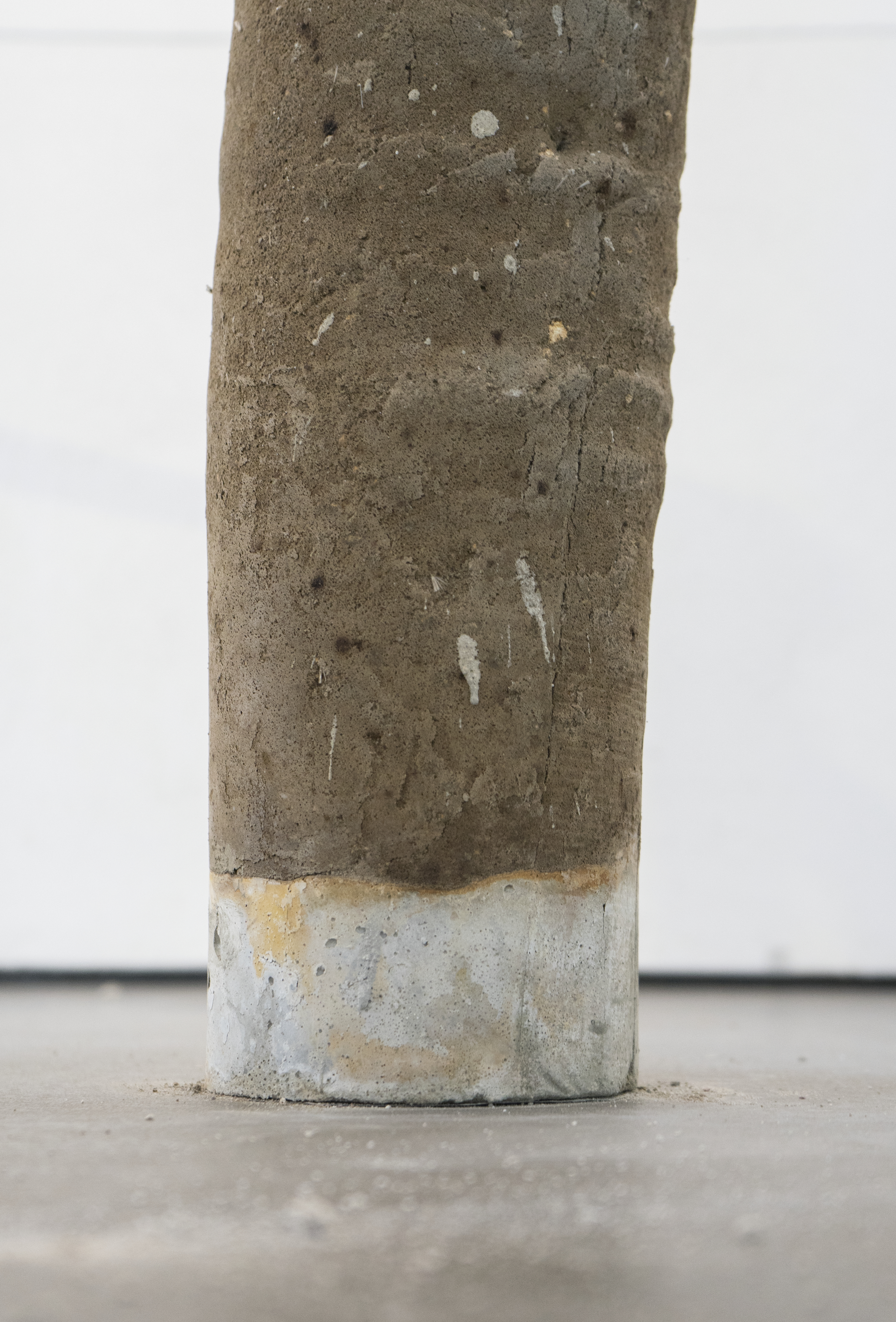 This group of sculptures is inspired by aerated concrete, the main structural building material of Haus Gropius, and examines specific characteristics of this construction material such as sound and visual appearance. When mixed in the studio the material quickly increases its volume by one hundred percent or more. The chemical reaction leads to gas-emissions that create a foam like structure in the material. The stubby concrete cylinders visually break with the expectations of standardized concrete. In contrast to the smooth and hard surfaces of the walls of the house, they seem rather fragile and sensitive. By using materials from the three Bauhaus sites (Kornhaus, Stahlhaus, and the Meisterhäuser) the sculptures relate directly to the place of their origin.