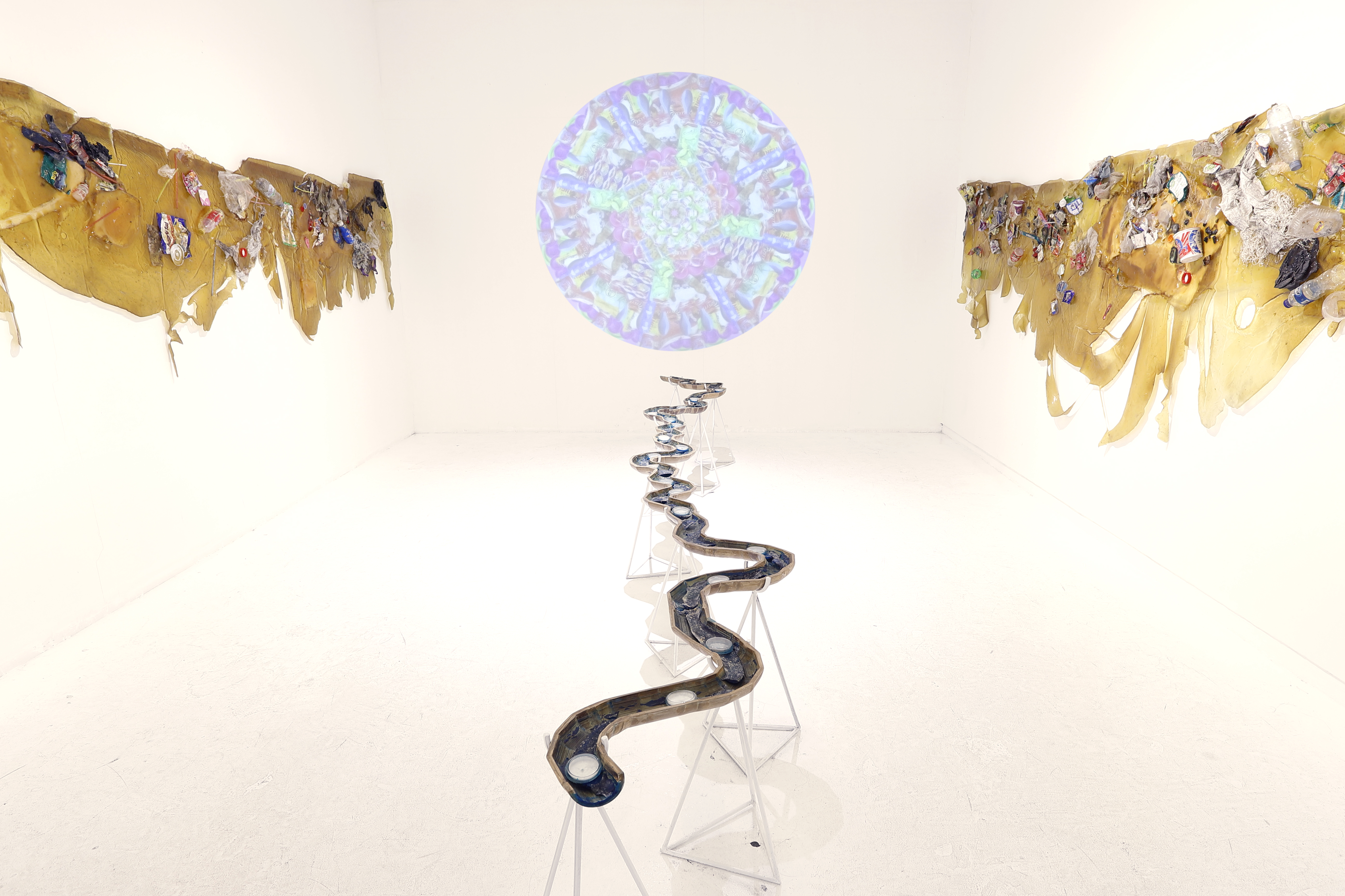 At first glance, River Code ("cho-deh") in Yogyakarta, Indonesia is a surreal landscape colonized by plastic, with its citizens believing their water is clean enough for daily use. While water is the medium that connects us all, it is also the primary carrier of the industrial molecules, simultaneously queering both the river and the bodies of its inhabitants. Can the citizens of River Code care for the health of the river as if it were their own bodies? Can mutation and shape-shifting be acknowledged as legitimate strategies for survival? The installation includes a rotating mandala projection composed of trash found in the river, symbolizing the constant recombination of plastic particles inside our own bodies. Next there is a bamboo sculpture of River Code filled with blue agar that invites microbial contamination juxtaposed against contained samples of bioremediating fungi. Lastly, the river is flanked by a set of two latex sculptures embodying the porosity of skin as it is embedded with trash from the river